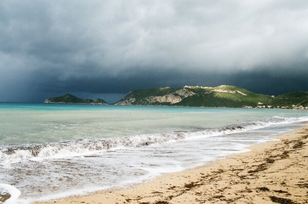 11. Keď sme boli v Grécku, na Korfu, celý deň bolo zamračené, pršalo, fúkal vietor a bolo to naozaj nádherné. Bol to jeden z najkrajších dní, aké som zažila. Zo zamračenej oblohy vykuklo zopár lúčov slnka, ktoré svietili presne na pár domov stojacich na kopci za morom.